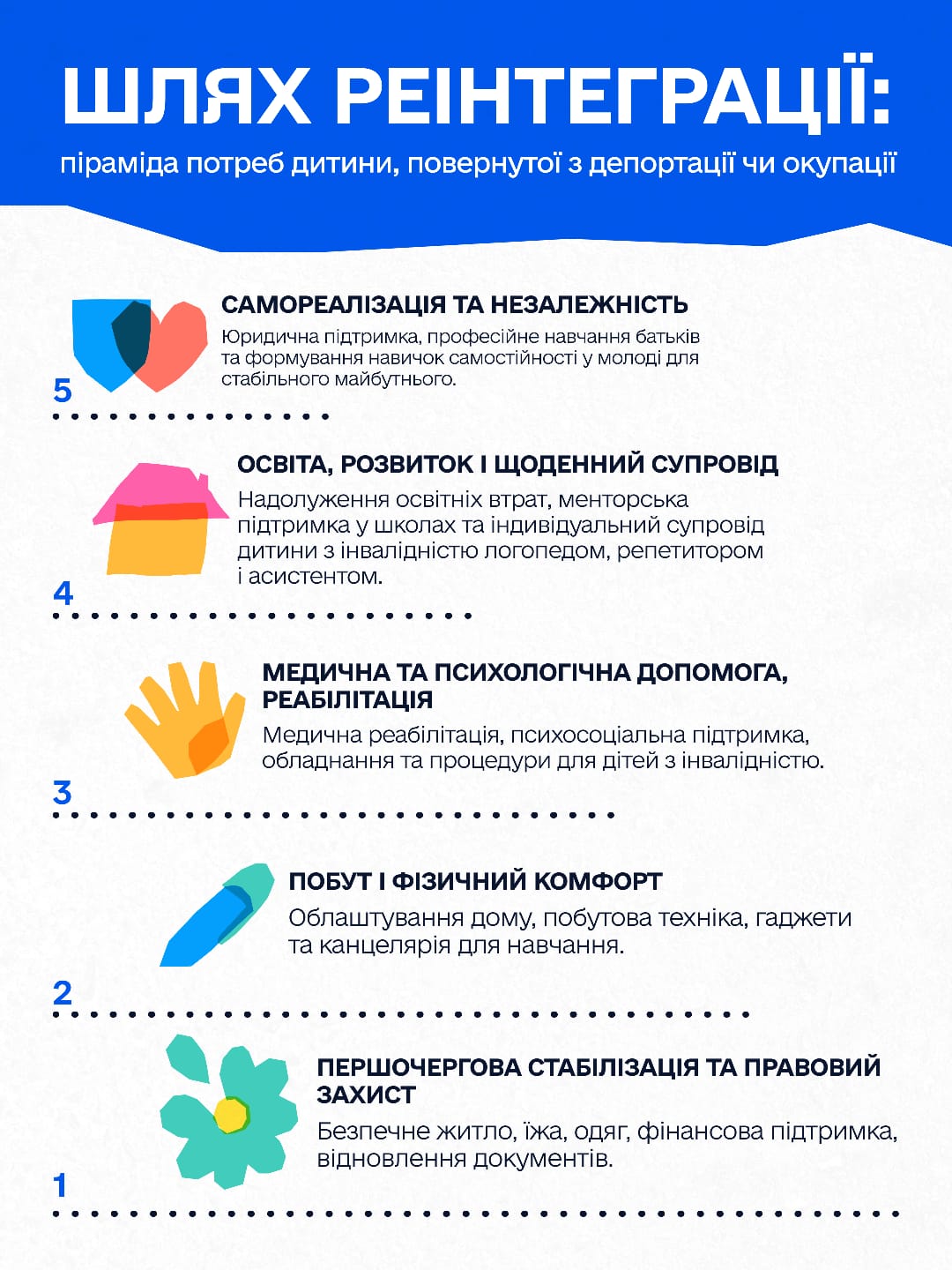 Цей шлях ми показали через інфографіку — піраміду потреб дитини, повернутої з депортації чи окупації. Вона побудована за логікою піраміди потреб Абрахама Маслоу, але замість абстрактних понять — реальні потреби дітей і родин.